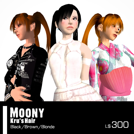 Kru's Hair Moony L$300 It's my first hair It seems like hair of "Sailor Moon", so I named this hair "Moony". This hair include 3 colors. Black,Brown and blonde. I like blonde one. but it doesn't suit me X(