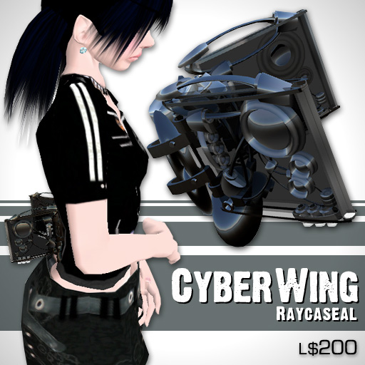 Raycaseal - Cyber Wing L$200 This small mechanical wings make you flying higher! If you are looking for accessory something strange, try this wings! This wings use 130prim, high detailed! but it is not so useful excluding flying higher. XD This wings have light function too. If you say "/7 light on", light will be turn on.